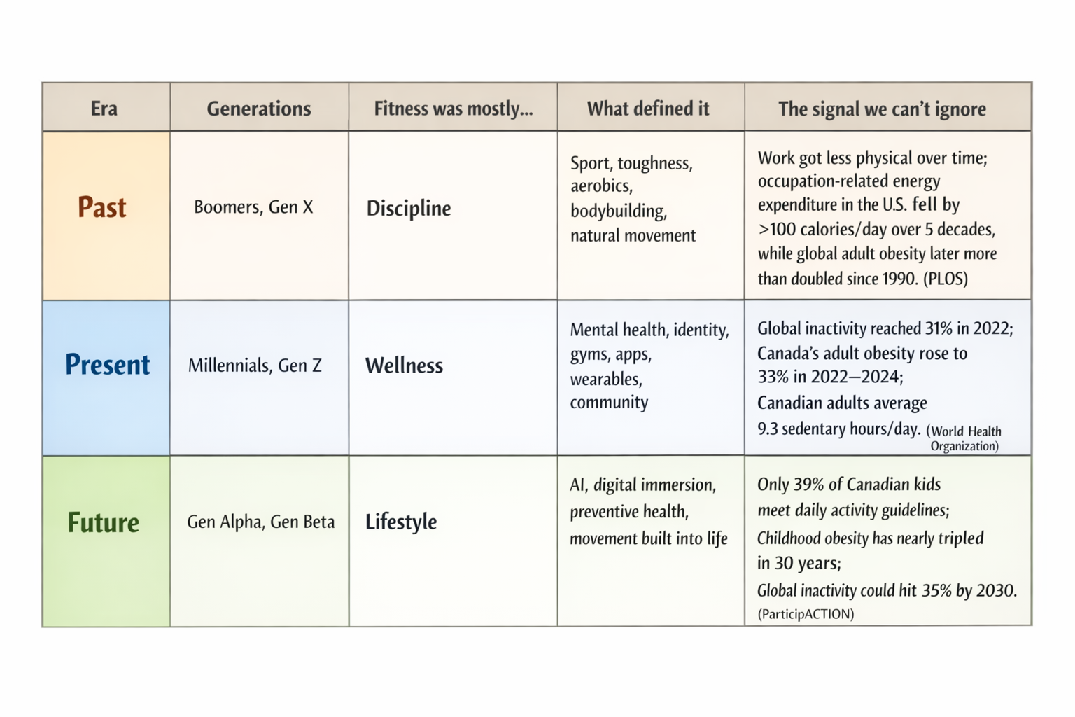 For Baby Boomers and Gen X, fitness was often framed as toughness, discipline, performance, and body control.